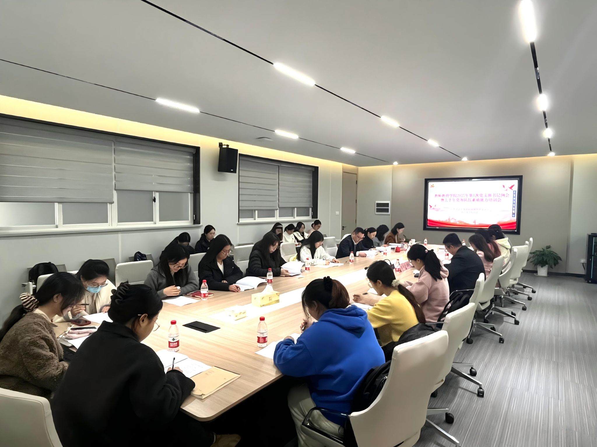 随后,张林向会议传达学习了全省党的建设工作会议和全省高校党的建设工作会议精神以及学校党委2025年第1次二级党组织书记例会上提出的思想铸魂、对标争先、党建领航、组织育人、干部淬炼、赋能发展等六项行动。针对学院近几年党建发展中存在的不足与短板,张林指出,各支部应以教育家精神为指引,结合专业特色与人才培养目标,策划开展具有亮点的活动,推动学院各项工作高质量发展。会议对学院2025年党建重点工作进行了全面部署,具体涵盖五个方面:思想建设方面,创新理论学习方式,开展实践活动,重视党建研究成果产出;组织建设方面,发挥支部书记凝心聚力作用,开展样板支部建设,选拔党员标兵等优秀典型;阵地建设方面,推进楼道文化靓化工程,完善春雨书院党群服务中心和教育物件陈列馆的建设;品牌建设方面,凸显师范生特色,充分发挥现有活动品牌优势;文化建设方面,加强各级媒体对特色活动的宣传报道力度。