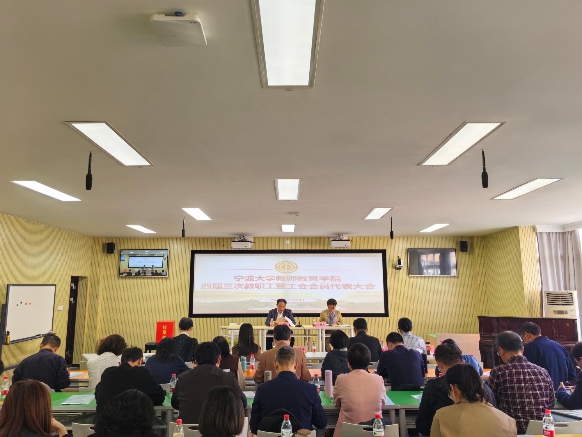 四届三次教职工暨工会会员代表大会在实验楼306智慧教室顺利召开。会议由学院分工会主席陈蕾主持,学院党委书记方莹芬为会议执行主席。会议应到代表44人,实到42人,因事因病请假2人。