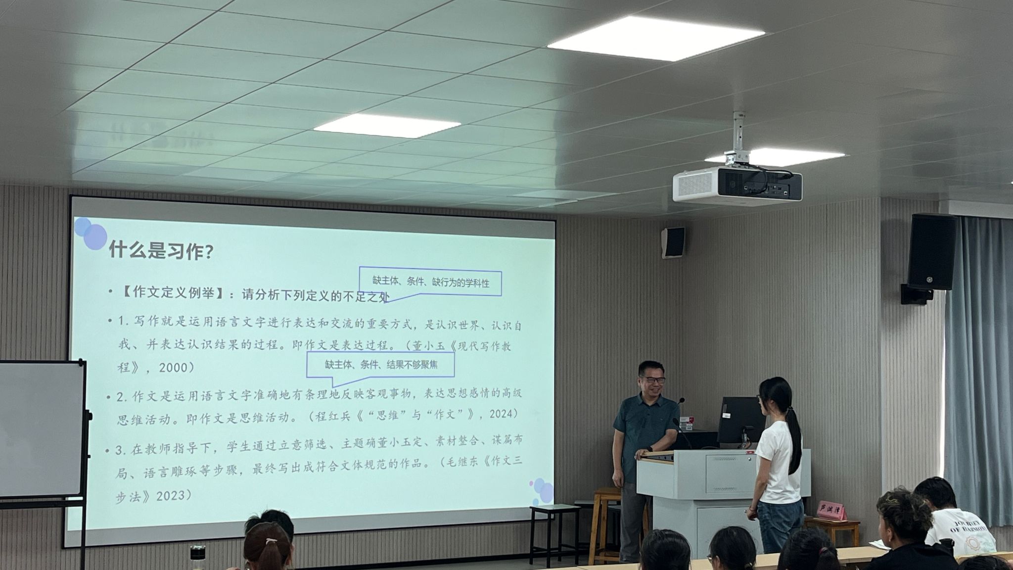 课堂上,冯教授以检视阅读法(RKRIA模型)为思维工具,指导学生通过“阅读语料-提炼关键词-分析关系-提出论题-系统设计”五步法,对比常规习作与诗意习作教学的差异。在《阳光》案例赏析中,学生深刻体会到习作教学如何浸润“爱与感恩”的思政元素,领悟“为文与为人”的辩证关系。