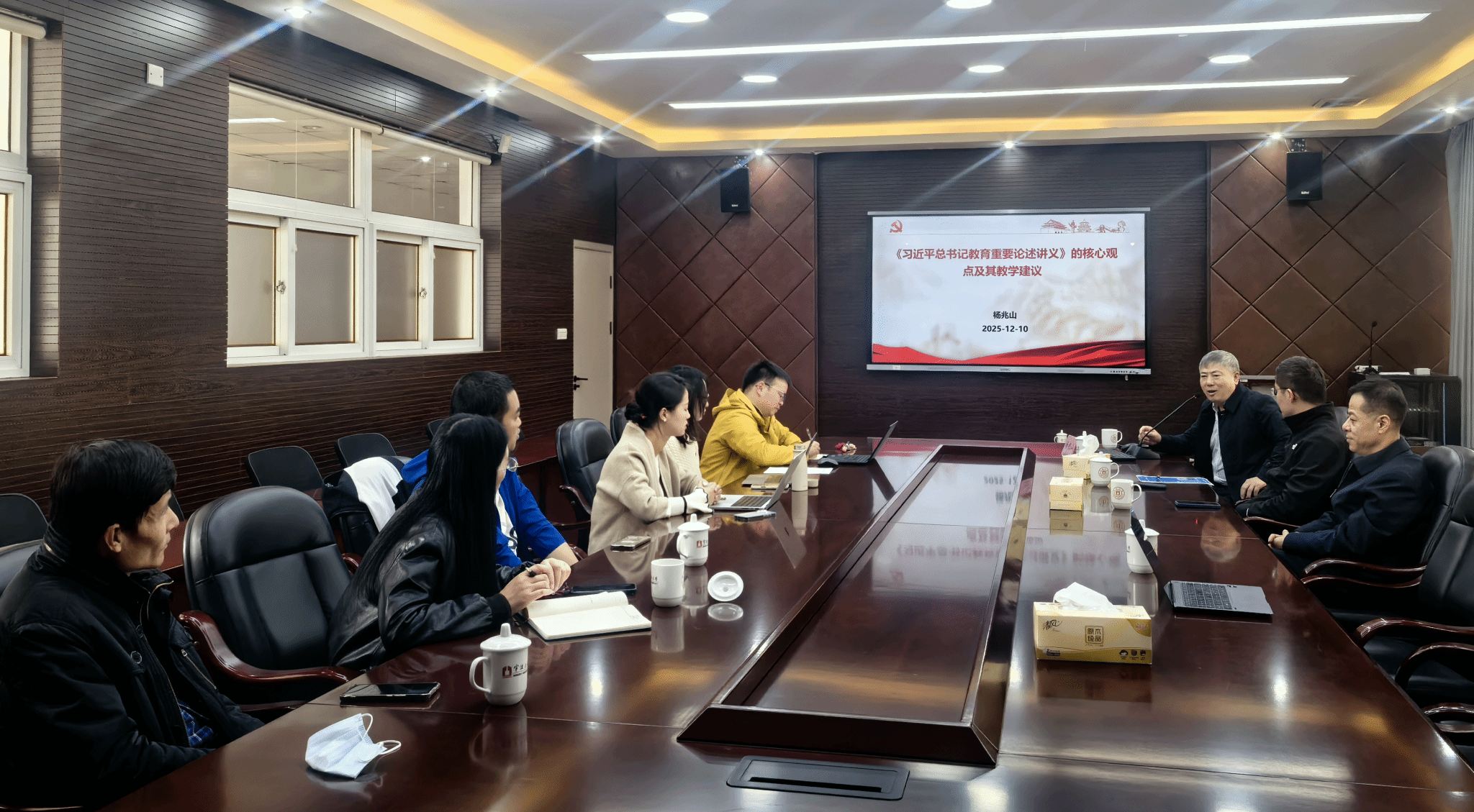 “风华师道”系列教研活动第二期在教育楼307 成功举办。本次讲座特邀东北师范大学教育学部二级教授、博士生导师,马工程重点教材《习近平总书记教育重要论述讲义》编写组专家杨兆山教授主讲,学院院长张宝歌、副书记龚小红、教师教育系主任余利川及课程组部分青年教师共同参与,副院长尹军主持会议。