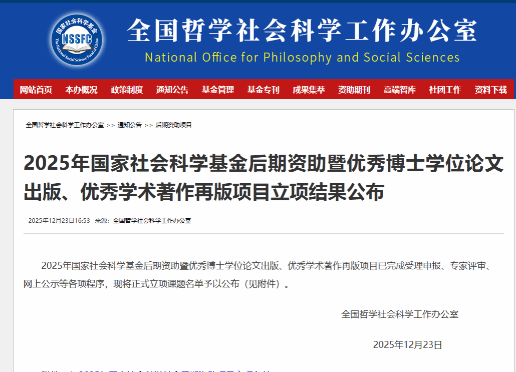 2025 年 12 月 23 日,全国哲学社会科学工作办公室正式公布 2025 年度国家社会科学基金后期资助暨优秀博士学位论文出版、优秀学术著作再版项目立项结果。18porn