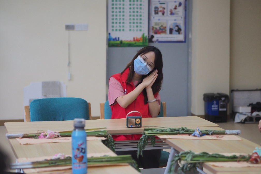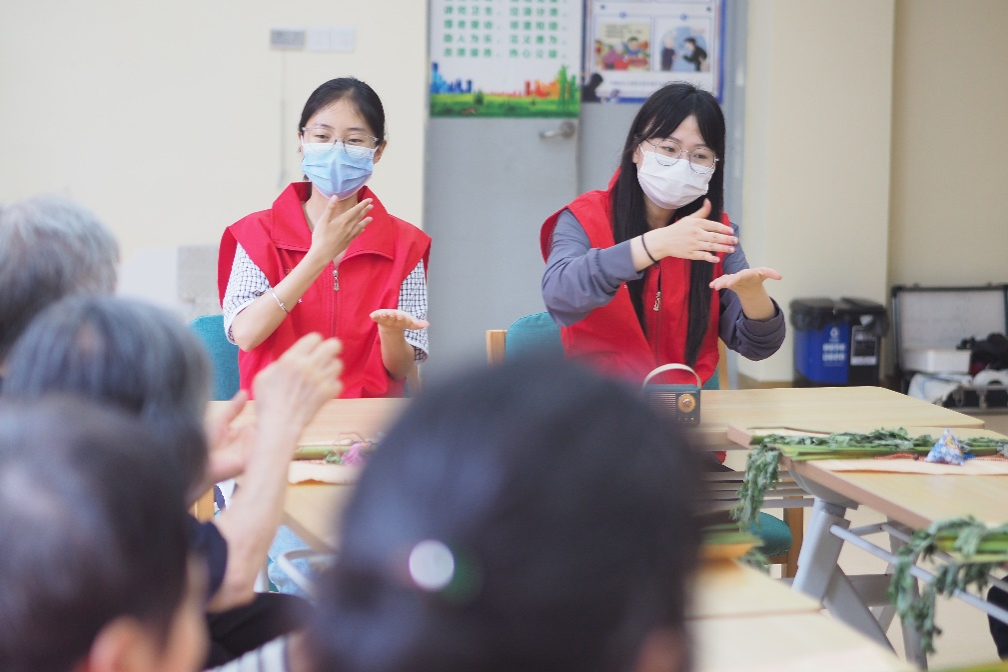 音乐节目欣赏结束,志愿者们依托简单的材料,与老人们共同制作象征趋利避害的艾草花束。在端午节,家家几乎都会悬挂艾草花束。