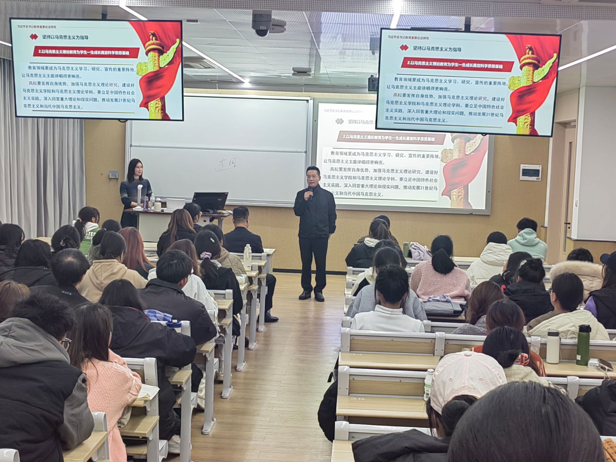 2023年12月12日下午,校党委书记朱达亲临课堂,认真听取了由孙立新教授主讲的《习近平总书记关于教育的重要论述研究》。学校教务处李国平处长、学院张宝歌院长和尹军副院长等陪同并听课。