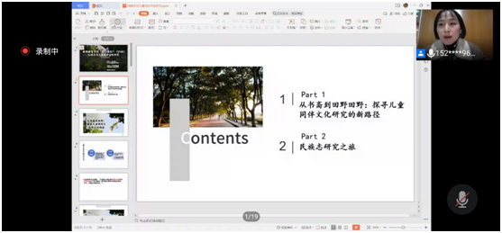报告会于下午1:00开始。首先,林兰博士从儿童同伴文化的质性研究出发,介绍了儿童文化研究的两种方法与儿童同伴文化的内涵,并详细介绍了她民族志的研究之旅,提出了民族志的内涵与选择民族志的原因。林兰博士还对民族志研究方法做了具体的介绍,指出针对幼年儿童进行的民族志研究具有三个特征:持续性与参与性,微观性与整体性,反思性与自我修正性,以及支撑民族志研究步步深入的核心特点:扎根田野、参与式观察、持续反思,最终获得“当地人”的视角解释问题的丰富资料。其次,林兰博士介绍了儿童同伴文化的田野研究的具体过程,并以展示实际案例的方式向大家展示了研究者在其中的角色定位与角色塑造,指出研究者的角色定位主要包含以下内容:一是角色塑造,二是身份管理,三是消极等待。再次,林兰博士从田野资料的收集、分析及理论建构的过程展开详细论述,并且十分详细的介绍了田野资料的整理与编码的过程与方法,并提出做质性研究需要研究者稳扎稳打、深入积累的要求,加深了大家对于质性研究的认识以及激发了对于田野研究相关的思考。最后,林兰博士阐述了研究之后的总结梳理与对研究效度及研究伦理问题反思,并同在座师生展开了积极的互动交流。