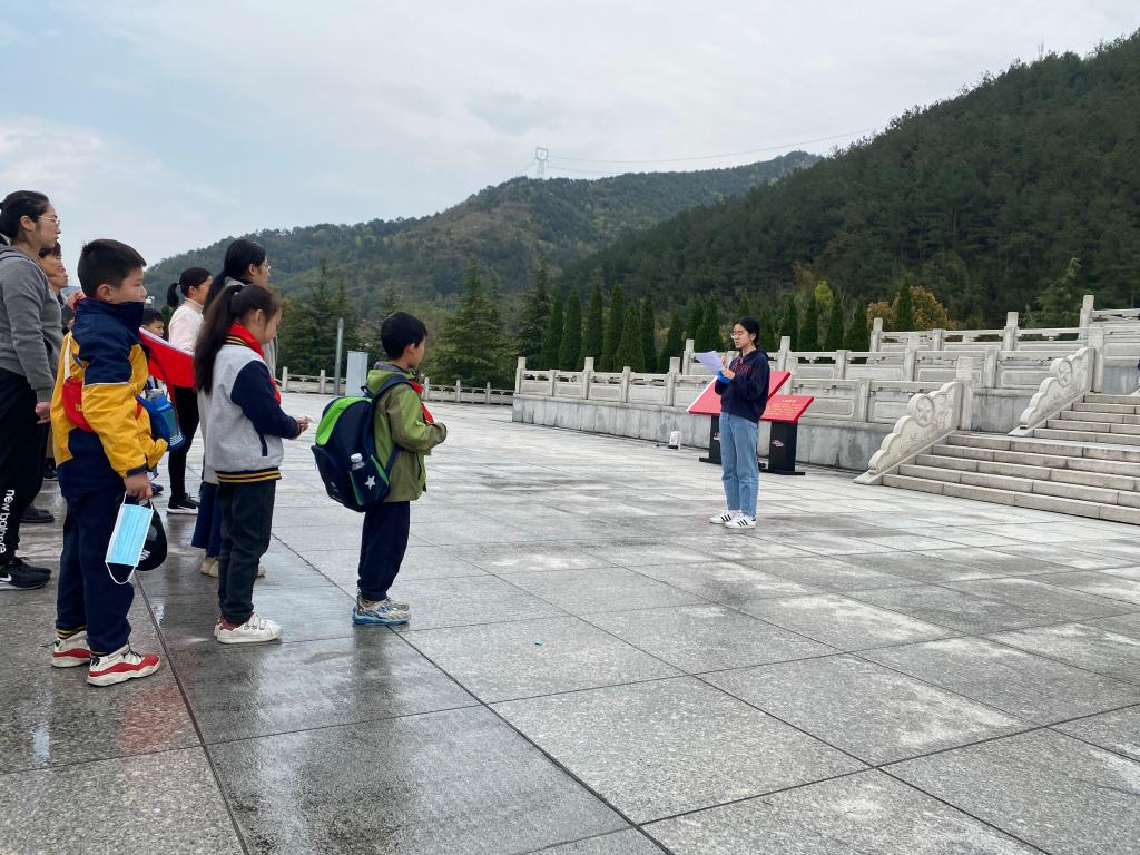 抵达四明山烈士纪念碑后,扫墓仪式在义教大队队长蒋栩蕾的主持下正式开始。全体摘帽,注视墓碑,少先队员迈着坚定的步伐,向革命烈士敬献花圈。随后,全体成员默哀3分钟致敬革命先烈。在少先队员代表发言后,全体学生合唱《我们是共产主义接班人》。紧接着队长领誓,全体少先队员向革命先烈敬队礼,向党旗敬礼。最后,学生们纷纷敬献白花,庄严三鞠躬,以此表达对先烈们最崇高的敬意与最深挚的追思。仪式结束,义教大队组织大家参观纪念馆,重温烈士们革命斗争的历史。