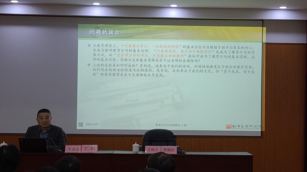 讲座伊始,丁钢教授以“只要努力学习,一定能取得回报”、“只要教得好,每个孩子都能学好”、“没有学不好的学生,只有教不好的教师”三个不合理的教育行为逻辑问题,引出了本次讲座的主题——教育行为与有限理性。