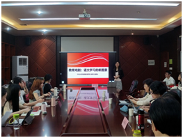 第二阶段由池夏冰博士进行汇报,主题是:“教育戏剧:语文学习的新图景”,报告主要基于语文学科教学展开,从教育戏剧的内涵、功能与实施路径等方面予以阐释。首先,池博士从《背影》这篇文章导入主题,指出疏于提供情景的传统讲授不利于学生更好地理解文本内容。因此,如何激活经典让学生体验父亲真正的情感十分重要,而教育戏剧是一种有效方式。教育戏剧简单来说就是将角色扮演融入教学之中。在自然开放的氛围里创设情境让学生参与进来,以合作、探究以及体验的方式展开学习,从而促进儿童的发展。接着,她从戏剧的价值角度提出教育戏剧能唤醒学生的运动感觉、促进学生产生移情、提升学生的创造力。然后,通过播放《愚公移山》等教学视频展示教育戏剧的主要路径包括准备阅读活动、参与表演活动、反思讨论活动。最后,池博士展示了教学策略的五部分:肢体剧场、朗读剧场、故事剧场、教师入戏、提问角色。接着,师生们就教育戏剧应用于语文教学的价值、方法、困境与出路等问题展开了讨论。
