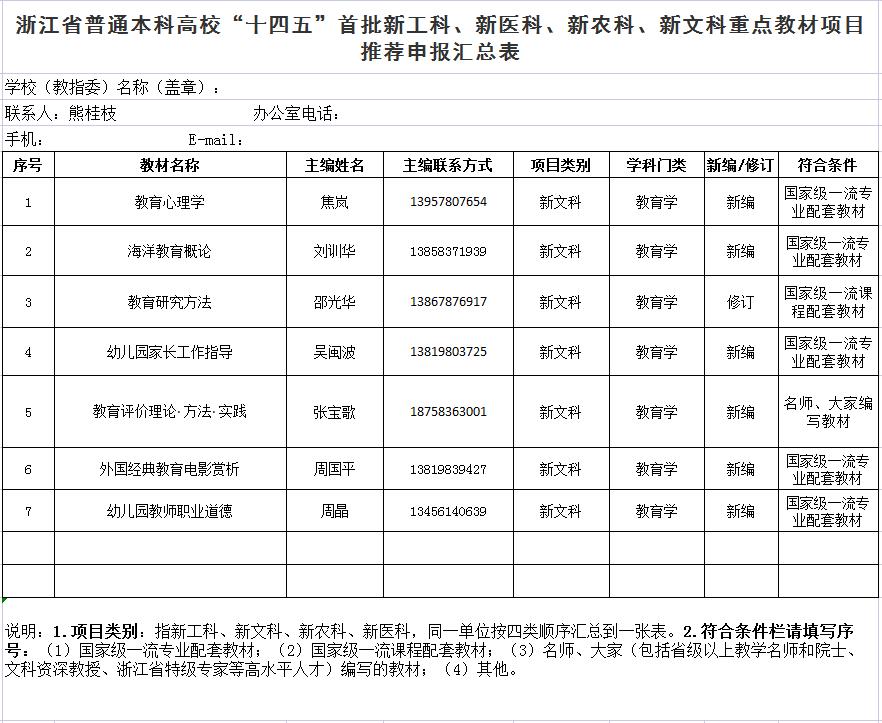 根据《关于开展浙江省普通本科高校“十四五”首批新工科、新医科、新农科、新文科重点教材建设项目申报工作的通知》要求,经会议评审,现对18porn 推荐申报结果进行公示(排名不分先后,按姓氏拼音首字母顺序排序):