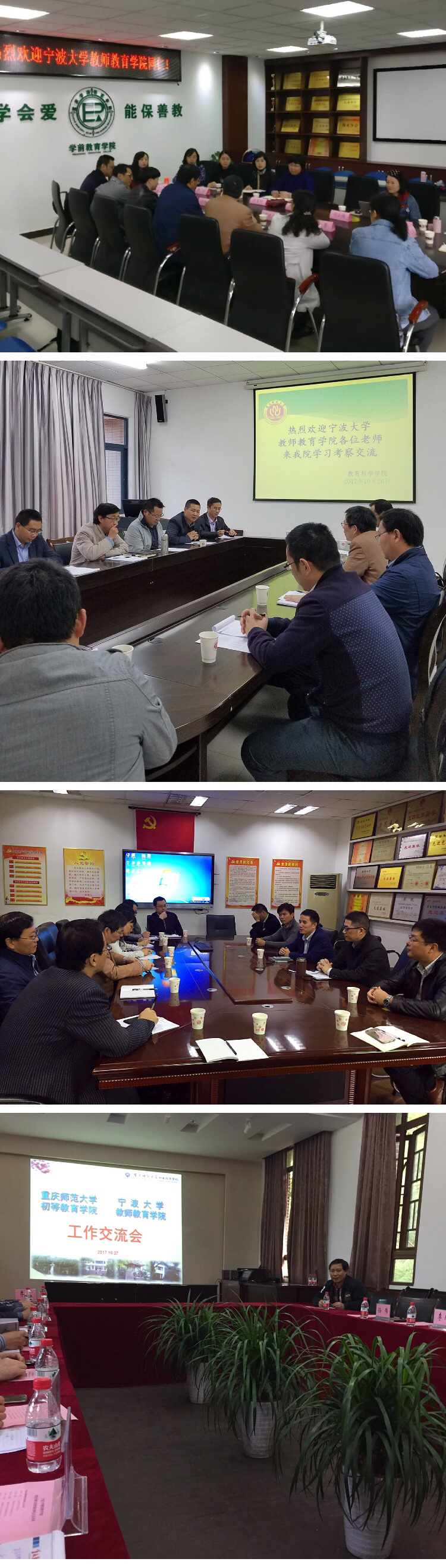 在西南大学教育学部,受到了部长王牧华的热情接待。交流会上,双方就小学教育、学前教育、应用心理学和英语专业人才培养、教学与科研之间的关系、教育国际化、学生考研、就业等问题展开了交流。会后,参观了学前教育实验室。
