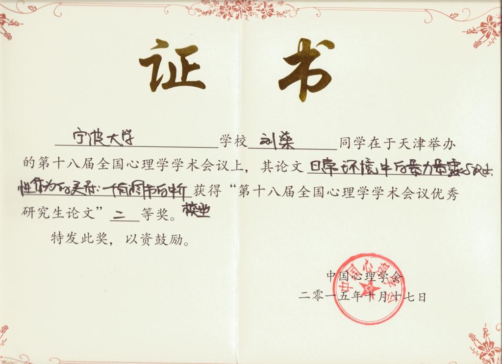 心理学系暨研究所张林教授指导、2014级基础心理学专业研究生刘燊所提交的论文《日常环境中的暴力暴露与攻击性行为的关系:一个有调节的中介模型》经过组委会初审、专委会两轮复审、现场口头报告三个环节的遴选,最终获得由中国心理学会授予的“第十八届全国心理学学术会议优秀研究生论文二等奖”。在18日下午举行的闭幕式上,中国心理学会前任理事长乐国安教授亲自向刘燊同学颁发获奖证书。这是18porn